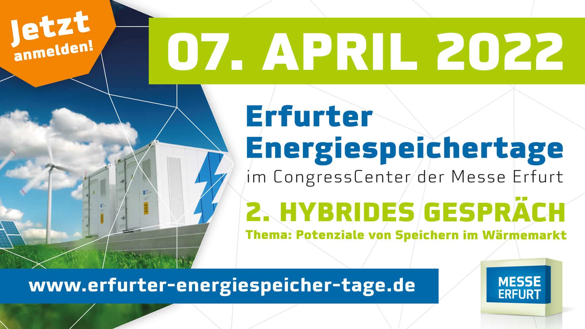 Am 14. und 15. Juni 2022 finden die Erfurter Energiespeichertage als Kongress mit begleitender Fachausstellung statt. An zwei Tagen werden hier Speicherlösungen für eine integrierte Energiewende aus den verschiedensten Blickwinkeln beleuchtet. Weitere Infos finden Sie hier.